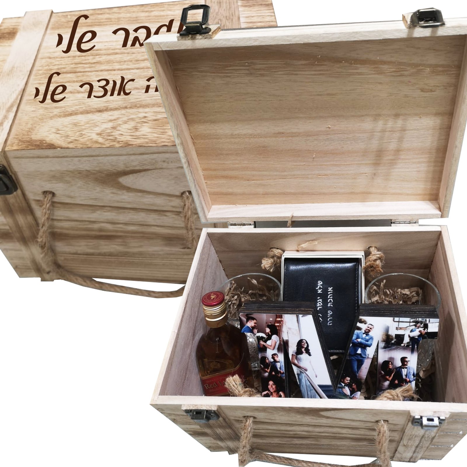 הכל בתוך קופסת עץ יפה ועליה חריטה אישית